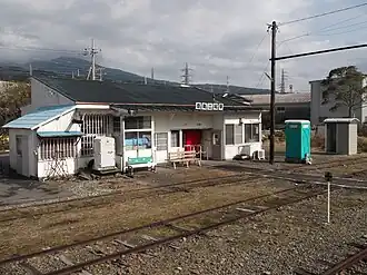Gakunan-Enoo Station is an unstaffed station with a bay platform serving two tracks. The wooden station building has no ticket machine, and is unattended.