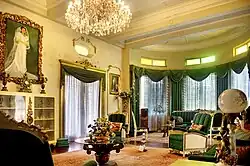 Most of the fixtures and furniture inside the house are of American and European origins. The crafted wooden pieces of furniture was designed and manufactured by Manila's leading furniture atelier, Don Gonzalo Puyat. Exquisite table wares are also on display and large wall mirror greets every visitor in the receiving area. A 19th century grand piano is also in the receiving area complemented by a vintage wooden radio in one corner of the room.