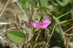 This plant is a creeping or climbing vine with gray-haired stems reaching up to 2 meters long. The shaggy hairs on the stem nodes may be up to 8 millimeters long. Each leaf is compound, made up of three hairy leaflets that measure 1 to 2 centimeters long. The inflorescence produces 1 to 5 pea flowers which are just over a centimeter long and pink to lavender in color.[1][2] The flowers are pollinated by the Cassius blue butterfly (Leptotes cassius theonus) and other insects.[3] The fruit is a hairy legume pod 3 or 4 centimeters long and a few millimeters wide.[1]