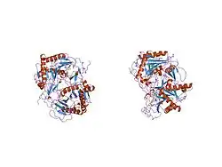 ^ abcdWedekind JE, Frey PA, Rayment I (September 1995). "Three-dimensional structure of galactose-1-phosphate uridylyltransferase from Escherichia coli at 1.8 A resolution". Biochemistry. 34 (35): 11049–11061. doi:10.1021/bi00035a010. PMID7669762.