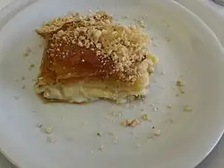 Galaktoboureko (Greek: γαλακτομπούρεκο, Laz: paponi, Turkish: laz böreği) is a dessert popular in Greece[5] and the eastern Black Sea Region of Turkey.[1][2] It is made of custard, layers of filo dough and covered in syrup.[6] Galaktoboureko is made with a type of pudding called muhallebi or semolina custard. In Albania, it is a dessert sometimes prepared during the Orthodox Easter, although Qumështor, an Albanian custard that includes no filo dough is traditionally preferred.[7][8]
