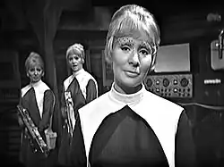 The Chumblies were named from the combination of the words "chum" and "friendly".[25] Production designer Richard Hunt created the Chumblies. Four robots were made, each about 3 feet (0.91 m) in height and consisting of three stacked domes made of fibreglass. Various stick-like appendages could be attached to the robot between the base and second dome, and these could be moved by the performer inside. A ring of small domes in the shape of rocket engine nozzles surrounded the base of each robot, hiding the casters on which the costume moved as well as imitating the propulsion units of the mechanoid.[26] The four warthog-like Rill costumes were made of grey-green painted fibreglass and latex. The costumes were largely immobile, although the performer inside could move the arms. To simulate the ammonia atmosphere the Rills breathed, dry ice fog was used.[24] Anthony Paul was hired to voice the Rills, but a late scheduling conflict prevented him from doing so;[27] he was replaced by Robert Cartland.[24] The Drahvins were originally named Dravians, and written as a race of male soldiers; during casting,[2] which took place in early June 1965,[21] Lambert suggested that their gender be switched to female,[2] in part as a nod to the emerging women's liberation movement and to better emphasise their attractiveness.[3] Emms concurred with the change.[2] Around this time, the Drahvin leader's name was changed from Gar to Maaga.[3] Some of the Chumbley performers—Angelo Muscat, Jimmy Kaye, and William Shearer—were hired through a company called Lester's Midgets.[21]