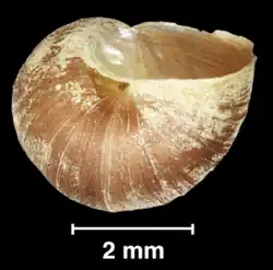 The shell is brownish to reddish light brown, thin-walled, elongated conical, usually with four regular convex whorls and up to 5.5 whorls in the longer specimens.[4] The whorls are somewhat inflated, slightly shouldered, with silky and longitudinally striated surface and separated by a deep, well-marked suture, increasing rather slowly in diameter.[4] The columella is straight, unfolded, and the umbilicus is open.[4] The last or body whorl is almost ¾ times as high as the shell height, presenting a slight twisting trend along its basal part visible in the biggest shells when viewed dorsally, and which is due to the enlargement of the basal lip of the peristome (in the way of Pseudosuccinea columella).[4] The spire is pointed.[4] The aperture is elongatedly oval, slightly oblique, mid-sized and wider at the base.[4] The thin peristome is patent throughout, the umbilicus is partially covered by a widened columellar lip.[4] The shell shows a tendency to be approximately one and a half to two times as long as it is wide, and its aperture tends to be slightly less than half as long as the shell.[4] The width of the shell is 1.39–4.31 mm.[4] The height of the shell is 2.41–8.06 mm.[4] The width of the aperture is 0.77–2.66 mm.[4] The height of the aperture is 1.16–4.12 mm.[4]
