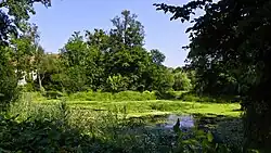The landscaped park on the estate covers an area of 4 hectares, similar to the one it occupied when it was founded in the 19th century. Originally it was the so-called English garden, but in the post-war period it lost most of the trees from its original design. The current owners, with the help of landscape architects, recreated its 19th-century layout. The park surrounds the palace on all sides, in the eastern part creating ponds and islands on the dammed waters of the Pisa River flowing through the village and estate.[1] In the western part, the park is located in the river valley. The park has specially marked paths leading through the best-kept parts of the gardens. One can also find numerous elements of the so-called small architecture such as footbridges, bridges, gazebos, wells, stone steps or an old cannon. The old-growth forest of the park currently consists of numerous lime trees, chestnut trees, oaks and hornbeams. In addition, there are also magnolias, rhododendrons, azaleas, maples, and commonly roses.[1]