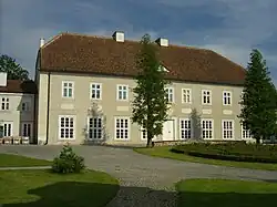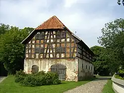 There is also an old granary on the estate. It was added in 1745 right in front of the entrance gate to the main palace complex. It has a rectangular plan with a hipped roof and two floors. It was built using the half-timbered technique with very visible beams, typical of the so-called half-timbered wall.[8]