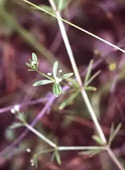 Galium trifidum is a usually perennial herb forming tangles of thin stems up to half a meter long, ringed with whorls of several linear to oval leaves. The inflorescence is a cluster of small white or pinkish flowers, each with usually three petal-like lobes in its corolla.[5][6][7]