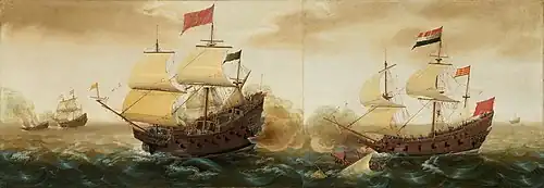 Galleons were large, multi-decked sailing ships developed in Spain and Portugal.[3][4] [5][6] They were first used as armed cargo carriers by Europeans from the 16th to 18th centuries during the Age of Sail, and they were the principal vessels drafted for use as warships until the Anglo-Dutch Wars of the mid-17th century.[7] Galleons generally carried three or more masts with a lateen fore-and-aft rig on the rear masts, were carvel built with a prominent squared off raised stern, and used square-rigged sail plans on their fore-mast and main-masts.