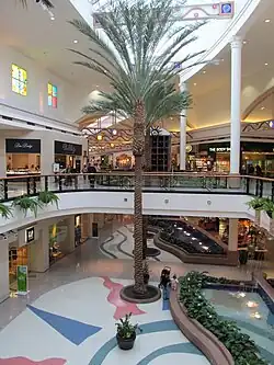 The mall initially had a southwestern theme and skylights.[20] Frommer's described it as the "most aesthetically pleasing" of the Las Vegas Valley's malls.[39] The 600-seat food court,[40] decorated with chess-piece topiaries,[20][23] included 12 eateries,[41] such as Cinnabon, Dairy Queen, and Hot Dog on a Stick.[20][42] The mall also had two full-service restaurants.[20] The parking lot contained 6,000 spaces, and valet parking was offered at the time of the mall's opening.[43]