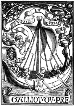 Galliot du Pré's imprint device featured a ship with an angel blowing a trumpet, which issues the words "Vogue la Guallee" (or sometimes "la galee").[2] The ship is a galiot, likely serving as a visual pun based on du Pré's first name.[3]