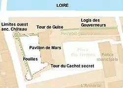 To the north, the enclosure, now separated from the Loire by André-Malraux quay, follows the ancient riverbank as closely as possible. This explains why it is not perfectly rectilinear in its eastern part.[S3 3] It serves as the base for the governor's residence along its entire length and the Tours castle (north gable wall of the Mars Pavilion) for modern buildings.
