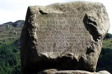 In 1929 on the 600th anniversary of Bruce's death, Bruce's Stone was placed high above the northern shore of Loch Trool from where legend has it that he had commanded the ambush which took place on the Steps of Trool on the other side of the loch. He lived for some 3 months as a fugitive in these hills before he was able to break out of his confinement and go on eventually to the much more significant victory at Bannockburn in 1314 which gave Scotland some relief in the first War of Independence and the near subjugation to the English Crown which had ensued after the death of King Alexander III on 19 March 1286.