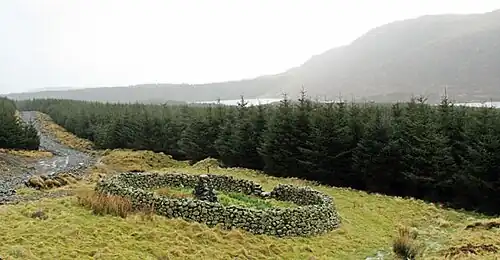Soon after this the land was taken over by the Forestry Commission and the sheep grazings became dense forest, but not before the death of a 17-year-old shepherd called Ralph Furlow, an employee of the Department of Agriculture, whose job it was to cross the Rhinns of Kells to tend to the sheep still in the Dungeon area. On 27 January 1954 he was overwhelmed in a snow storm and his death is commemorated by a monument just below Millfire on its east side.[18]