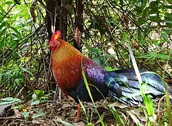 The Sri Lankan junglefowl (Gallus lafayettii sometimes spelled Gallus lafayetii), also known as the Ceylon junglefowl or Lafayette's junglefowl, is a member of the Galliformes bird order. It is a common endemic bird in Sri Lanka, where it is the national bird. It is closely related to the red junglefowl (G. gallus), the wild junglefowl from which the chicken was domesticated. However, it is even more closely related to the grey junglefowl. Sri Lankan junglefowl and red junglefowl diverged about 2.8 million years ago, whereas time of divergence between the Sri Lankan junglefowl and grey junglefowl was 1.8 million years ago.[2]