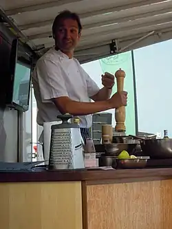 Blackiston represented the Midlands and East of England in the BBC's Great British Menu,[4] knocking out celebrity chef Antony Worrall Thompson to gain a place in the final.[5] In 2007, he appeared on the television programme Food Poker.[6] He has also appeared on Put Your Money Where Your Mouth Is, Country Show Cook Off,[7] and Saturday Kitchen.[8]