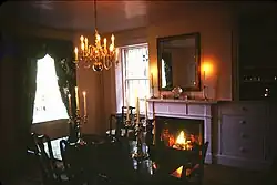 Forty handmade window sashes with 12-over-12 lights, based on one original in the house, were expertly handmade by restoration craftsman, Jerry Bates, and installed with brass runners. Reproduction historic wallpapers were used throughout, including Williamsburg patterns of the period in the front stairwell. Historically documented antique reproduction handmade lighting fixtures from Ball and Ball[27] in Pennsylvania were installed in the stairwell and other rooms. An entire new kitchen was installed, and the ceiling in the wooden ell at the back of the house was removed creating a cathedral ceilinged family room with loft. Bathrooms were completely replaced. Reproduction draperies from museum patterns were custom made for each room by historic fabric specialist, Lael Livak. Fine interior custom carpentry was by Sandy Packard. Plastering was done by Vermont's veteran master-plasterer, Willy Verchereau.(Restoration details are from flyer printed for house tour in 1982.)[28]
