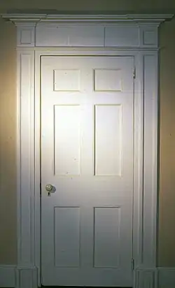 The front door is not original. It was originally topped by a classic fanlight and sidelights.[19] The small portico now above the door in front was added when the original door was sold during the 1930s, according to town legend.