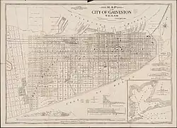 In 1839, the City of Galveston adopted a charter and was incorporated by the Congress of the Republic of Texas.[16][17] The city was by then a burgeoning port of entry and attracted many new residents in the 1840s and later among the flood of German immigrants to Texas, including Jewish merchants.[18] Together with ethnic Mexican residents, these groups tended to oppose slavery, support the Union during the Civil War, and join the Republican Party after the war.