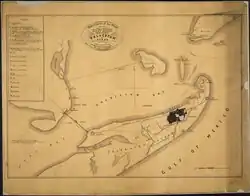 Indigenous inhabitants of Galveston Island called the island Auia.[8] Though there is no certainty regarding their route and their landings, Cabeza de Vaca and his crew were shipwrecked at a place he called "Isla de Malhado" in November 1528. This could have referred to Galveston Island or San Luis Island.[9] During his charting of the Gulf Coast in 1785, the Spanish explorer José de Evia labeled the water features surrounding the island "Bd. de Galvestown" and "Bahia de Galvestowm" [sic]. He was working under the orders of Bernardo de Gálvez. In his early chart, he calls the western end of the island "Isla de San Luis" and the eastern end "Pt. de Culebras". Evia did not label the island itself on his map of 1799. Just five years later Alexander von Humboldt borrowed the place names Isla de San Luis, Pte. De Culebras, and Bahia de Galveston. Stephen F. Austin followed his predecessors in the use of "San Luis Island", but introduced "Galveston" to refer to the little village at the east end of the island. Evidence of the name Galveston Island appears on the 1833 David H. Burr.[8]