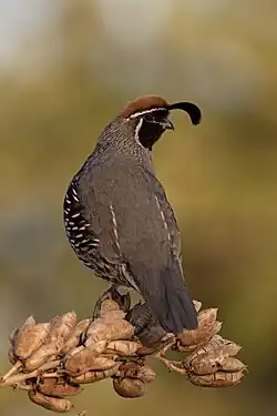 Gambel's quail (Callipepla gambelii) is a small ground-dwelling bird in the New World quail family. It inhabits the desert regions of Arizona, California, Colorado, New Mexico, Nevada, Utah, Texas, and Sonora; also New Mexico-border Chihuahua and the Colorado River region of Baja California. Gambel's quail is named in honor of William Gambel, a 19th-century naturalist and explorer of the Southwestern United States.