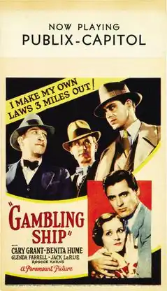 Gambling Ship is a 1933 American pre-Code drama film directed by Louis J. Gasnier and Max Marcin, and starring Cary Grant and Benita Hume. It was based on Paul Cain's short stories: "Fast One", "Lead Party", "Velvet" and "The Heat", which were published in Black Mask magazine. It was released on June 23, 1933.[1][2] Ace Corbin retires from the racket as a gambling boss, but the enemies attempt to stop him.