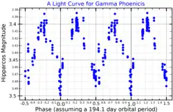 γ Phoenicis is a spectroscopic binary and a small amplitude variable star. The star system shows regular variations in brightness that were reported as a 97.5 day period in the Hipparcos catalogue,[1] but have since been ascribed to a 194.1-day orbital period with primary and secondary minima.[11] Although the light curve appears to show eclipses, the high orbital inclination suggests the variations are due to ellipsoidal stars as they rotate in their orbit.[6] γ Phoenicis is listed in the General Catalogue of Variable Stars as a possible slow irregular variable with a range from 3.39 to 3.49, the same as reported for the eclipses or ellipsoidal variations.[5]