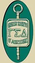 The Society's emblem is a key, which bears the words "The Honor Society of Agriculture" with the Greek letters ΓΣΔ as its insignia. These three letters stand for the Greek words, Gaea, Syndesmos and Demeter, which in turn were chosen for their symbolism, which is further explained as, "The binding together of earth, the mother of all, and the practice of agriculture, and the arts relating thereto for the welfare of mankind."[2]