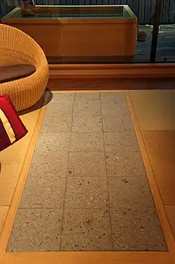 Body-sized stones, such as germanium, are installed into the floor of a room which is usually heated to around 40-50°C (104-122°F).[1] Bathers, usually dressed in kannaigi (館内着) which is a type of casual Japanese indoor wear similar to samue, place a bath towel on a stone and lie on it.[2] The stones themselves are heated. The room's temperature, which is similar to that of a low-temperature sauna, combined with the heat of the stone cause users to sweat.