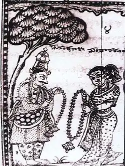 A Gandharva marriage (Sanskrit: गान्धर्व विवाह, gāndharva vivāha, IPA: [gənd̪ʱərvə vɪvaːhə]) is one of the eight classical types of Hindu marriage. This ancient tradition from the Indian subcontinent was based on consensual acceptance between two people, with no rituals, witnesses or family participation.[1] The marriage of Dushyanta and Shakuntala is a historically celebrated example of this class of marriage.[2]