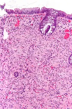 Ganglioneuroma (occasionally called a "ganglioma") is a rare and benign tumor of the autonomic nerve fibers arising from neural crest sympathogonia (undifferentiated cells of the sympathetic nervous system).[1] However, ganglioneuromas themselves are fully differentiated neuronal tumors that do not contain immature elements.[2]