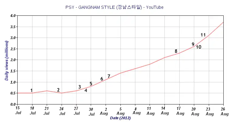 On September 3, 2012, the number of daily views generated by "Gangnam Style" went past the 5-million mark.[105] By the end of September, it had topped the iTunes charts in 31 countries.[106]