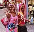 Yamanba (ヤマンバ), also sometimes shortened to just manba (マンバ),[8][2] is a more extreme style that evolved from ganguro. Old school yamanba featured deep tans and white lipstick, pastel eye makeup, tiny metallic or glittery adhesives below the eyes, brightly colored circle lenses, vibrant clothing, and incongruous accessories, such as Hawaiian leis. While yamanba faded in popularity it also started to become more extreme, with multicolored and usually synthetic hair. Manba in 2008 saw a darker tan, and no facial stickers. Hair was usually neon/bright colors, with pink being a favorite. Wool-emulating dreadlocks, extensions, and clips were worn to make the hair appear longer. Clothing remained the same, although leis were worn less frequently.[2]