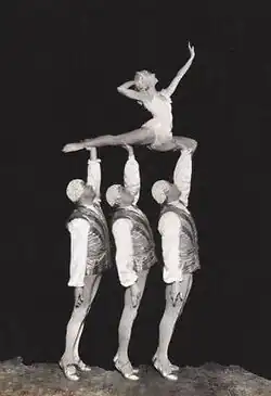 When Hendricks left in 1931, they were joined by brother Serge, and by a female ballet-trained artist's model, Detroit-born Juanita Richards.[4] Billed as the Ganjou Brothers and Juanita, they travelled to England in 1933, and appeared at that year's Royal Variety Performance, when they were supplemented by two opera singers, Aline Fournier and Vittorio Toso.[2] They all dressed in the style of Dresden china figures, and were billed as A Romance in Porcelain. They toured theatres in Britain, achieving considerable popularity, but in 1934 Juanita left to marry an English man she had met in Blackpool.[3]