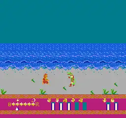 It is possible to die of starvation and/or hunger without the proper food/drink items. A meter for water and food are automatically deducted for every move that is made while travelling from landmark to landmark. These food and drink items are found inside people's houses for consumption. Houses appears as buildings representing pagodas. Certain landmarks must be entered in order to progress the game's storyline; these are represented in-game as a grey square with a drawbridge-like structure. An onslaught of enemies must be defeated in the side-scrolling segments of the game.