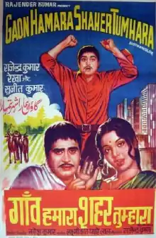 Gaon Hamara Shaher Tumhara (transl. Our Village, Your City) is a 1972 Bollywood romance film directed by Naresh Kumar. It stars Rajendra Kumar, Rekha in lead roles.