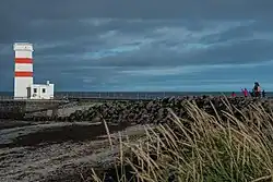 Garður is also known for its lighthouses. The old Garðskagi Lighthouse [ˈkarðsˌskaijɪ] was built in 1897 and was used until recently as a centre for studying the thousands of migrating birds which arrive there from Greenland and North America every year to breed on the surrounding shore. Today there is a restaurant located here, known as The Old Lighthouse Cafe/Rostin Restaurant which serves a small menu of meals. A new one was built in 1944.[3]
