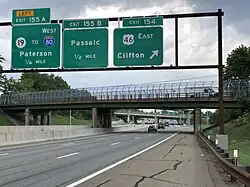 In May 1962, plans were announced to widen the segment from exit 154 to just near exit 158 from two lanes to three lanes.[81] As part of this project, the Passaic River Bridge was to be reconstructed with a wider superstructure and piers. The Bergen Toll Plaza also was rebuilt to give each direction dedicated toll canopies instead of all traffic merging into a single canopy, as then existed. This part of the project was completed in December 1963.[82] A two-mile segment of roadway from the Passaic County line to exit 154 also was repaved, to add a one-inch overlay of asphalt. This project also included lengthening and widening northbound acceleration lanes to exit 153A, exit 153B, and the grounded ramp at exit 154. This part of the project began on August 1 and was completed by October 31.[83] Construction also began on a new exit 159. This interchange would serve Interstate 80 with direct connections and Midland Avenue with indirect connections. In preparation for this construction, the northbound exit and southbound entrance of exit 158 were closed permanently on March 16, 1963,[84] with the remaining connections closed on June 22.[83] On December 23 of that year, the ramps onto Midland Avenue from exit 159 were opened to traffic. Tolling of the interchange began immediately.[82] However, the ramps to and from I-80 would not open until October 20, 1964. The project cost a total of $4,500,000.[85] In November of that year, the northbound exit and southbound entrance at exit 157 were permanently closed, to encourage use of exit 159.[86]