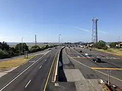 In 1972, the dualization of the Great Egg Harbor Bridge eliminated the final two-lane segment of the parkway.[106] On September 18, 1969, a new exit 129 were opened,[107] the remaining ramps were opened to traffic by early 1970. This replaced the existing interchange, and made it so that the turnpike had direct connections to both directions and vice versa. On November 24, 1970, southbound parkway traffic from there south to the Raritan River was redirected onto a new roadway that lied in the median of the old one, the old were not demolished however, but rather became an exit onto U.S. Route 9, effectively creating a collector-distributor road.[108] This bypass effectively eliminated the two former exits, while these still exist, they are now Route 9 exits.[109] On August 17, 1971, the same switch occurred to the northbound roadway, the old one also became a collector-distributor road, though it rather served as a U.S. Route 9 ramp to connect to the northbound GSP as well as the New Jersey Turnpike.[110]