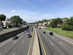 In the mid-1960s, a project to reconstruct interchanges in Essex County was undertaken. On January 1, 1966, a project was completed that constructed longer deceleration lanes and widened the exit and entrance ramps of exits 148 and 144.[89] On January 10, tolling began on exit 148.[90] In December 1965, a related project began to reconstruct exit 143. It would contain a collector-distributor roadway. The project was completed on April 12, 1966,[91] exit 142 was then renumbered as exit 143 .[90] Additionally, in December 1965, plans were announced to replace exits 145. Unlike the old ramps, this new one would provide access to I-280. Also as part of this project, exit 146 would be demolished, and an overpass would be built to replace part of the depressed roadway. The exits 146 and 145 were permanently closed to traffic in late 1965. On January 12, 1966, the replacement exit 145 were opened to traffic, though the ramps onto I-280 at the latter remained barricaded off while the highway was still under construction. On October 13, 1967, the I-280 segment and its ramps were partially opened, completing the project.[92] These projects were carried out to reduce congestion, which had previously run rampant due to its interchanges being largely free of tolls.[93]