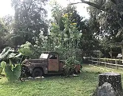 - found objects such as recycled bowling balls, toilet planters, antique farm equipment