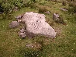 The area's best-known archaeological feature is the cup-and-ring-marked stone (petroglyph) located at Ordnance Survey grid reference SK273730.[1] The carved stone was discovered in the 1940s and has subsequently been buried under a replica to protect it from weathering and other damage. Another replica is on display in the Weston Park Museum.