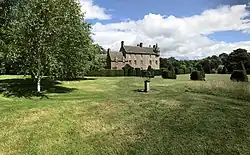 The house was built by the Gardyne family,[2] and an inscribed stone records the date 1568.[1][3] A further inscribed stone moved from the neighbouring home farm bears the arms of King James VI and the motto "God save the King". Together with the distinctive style of some of the architectural features, such as the conical-roofed bartizans, this suggests an attempt to link the building with Royal Stewart architecture, and with the new king, as opposed to his predecessor the deposed Mary, Queen of Scots.[4]
