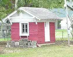After Garfield died 12 days later on September 19,[4] the tracks were torn up and the wooden ties were purchased by actor Oliver Doud Byron, who had local carpenter William Presley build the Garfield Tea House with them. It first stood in the yard of Byron's summer cottage. One of the original rails is used as the ridgepole supporting the roof. The original colors of the building were red, white, and blue; today it is red and white. After several moves, including one to the Presley home in North Long Branch, the tea house now rests on the Long Branch Historical Museum grounds on Ocean Avenue near the former site of Francklyn cottage. The remains of the railroad spur tracks near the former cottage became part of a small one-lane residential road near the beach which is now called Garfield Road.[1]