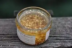 Garlic-flavored oil is produced and used for cooking and seasoning purposes, and is sometimes used as an ingredient in seasoning mixtures.[2][6] This differs from essential garlic oil, and typically involves the use of chopped, macerated or crushed garlic placed in various vegetable oils to flavor the oil.[1]