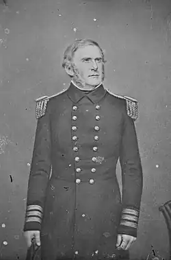 At the outbreak of the American Civil War in 1861, Pendergrast was in command of the frigate Cumberland at anchor near the Gosport Navy Yard awaiting repairs. The Secretary of the Navy, Gideon Welles, ordered Pendergrast to remain in the Hampton Roads area to protect Gosport Navy Yard and Fort Monroe.[11][12] Pendergrast positioned the Cumberland off the harbor to either defend it or protect the escape of Federal ships.[13] Most of the blame for the loss of the Gosport Navy Yard fell to Charles Stewart McCauley although some of it was also placed on Pendergrast who controlled the Federal fleet on the Atlantic coast.[14]