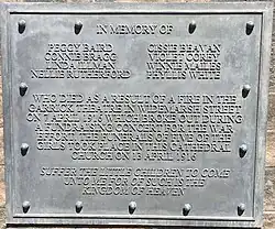 Plaque at the Lady Arbour, Hereford Cathedral dedicated to those who died in the Garrick Theatre Fire of 1916