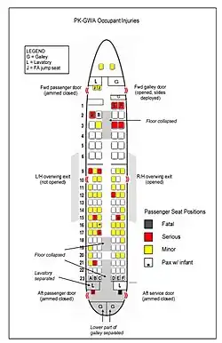 There was severe damage to the submerged aircraft belly, especially near the tail, leading to the inference that it landed nose high with tail impacting the shallow river bed, which ripped away the cabin floor together with the two flight attendants seated there. Both were found with severe injuries in the river behind the aircraft, and one did not survive. Twelve passengers suffered injuries, while the flight crew and other two flight attendants were injured. The aircraft was written off as a total loss, making the accident the 11th hull loss and eighth fatal accident involving the Boeing 737-300.[5]