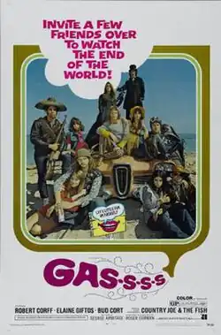 Gas-s-s-s (on-screen title: Gas! -Or- It Became Necessary to Destroy the World in Order to Save It.) is a 1970 American post-apocalyptic black comedy film directed by Roger Corman, written by George Armitage, and produced and released by American International Pictures. The plot follows survivors of an accidental military gas leak involving an experimental agent that kills everyone on Earth over the age of 25 (a cartoon title sequence shows a John Wayne-esque Army General announcing — and denouncing — the "accident"; the story picks up as the last of the victims are dying with social commentary on Medicare and Medicaid). The subtitle alludes to the 1968 quote "it became necessary to destroy the town to save it" attributed to a U.S. Army officer after the Battle of Bến Tre in Vietnam.
