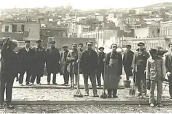The younger brother, Imran Gasimov, being a very experienced contractor, was also a passionate art lover and an avid theatre-goer. He was also one of the first Azerbaijani actors. The rehearsals of the first national Azerbaijani opera "Leyli and Majnun",[6][7] in 1907, were held in a large hall on the third floor of the Gasimovs' house.[8] Imran Gasimov, a close friend of Uzeyir Hajibeyov, himself suggested this to the composer and took an active part in the preparation of the opera. Kasumov, who took on the acting pseudonym "Kengerlinsky", also played two roles in the premiere production of the opera "Leyli and Majnun" on 25 January 1908 - Leili's father, Fattah, and Mejnun's friend, Zeid. According to some reports, he also played the role of Nofel. In addition to his native language, he spoke Russian and French. He provided material support to the families of many actors. After a fire in a well-known bookstore at the intersection of Nikolaevskaya and Persidskaya streets (nowadays Istiglaliyyat and Murtuza Mukhtarov, respectively), Imran Gasimov completely took over not only its reconstruction, but also the purchase of new valuable books.[9] Imran Gasimov died in an accident. As a contractor for the Murtuza Mukhtarov Palace under construction (nowadays the Saadat Palace),[10] he personally supervised the installation of the statues, the decoration and the domes. During the installation on the upper tiers of the palace of a knight sculpture, which is still adorned there, he fell down. Unable to withstand the grief, his wife Rubaba khanim, poisoned herself 2 weeks later.[11][12]