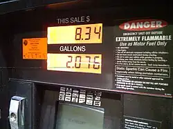 The equipment must accurately measure the amount of fuel pumped. Flow measurement is almost always done by a 4 stroke piston meter connected to an electronic encoder.[8] In older gasoline pumps, the meter is physically coupled to reeled numerical displays (moving wheels or cylinders with numbers on the side), while newer pumps turn the meter's movement into electrical pulses using a rotary encoder.