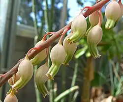The flowers generally appear on a long stem of about 30 cm (12 in), that carries tubular bell-shaped pink to orange flowers.[1][2]